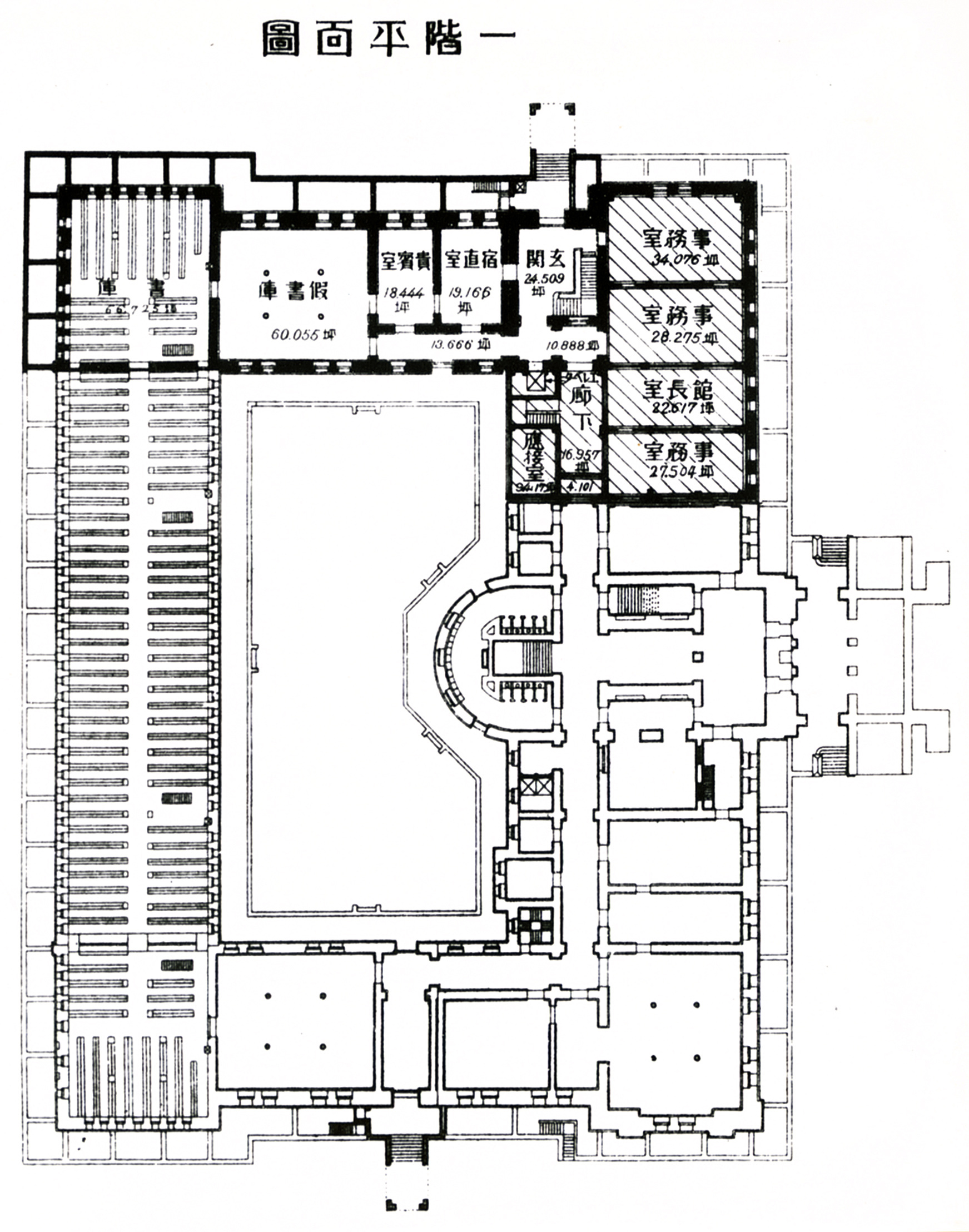 旧帝国図書館について補足しますと、実は当初、現在の建物の4倍程の規模のものが構想されていました。これ(レンガ棟)を一辺としてロの字型の非常に大きな建物を造るつもりだったのです。ところが、当時日露戦争が終わった頃で財政が逼迫していましたので、予算が削られてしまい、4分の1程の規模で我慢することになりました。最初のロの字型の構想の一辺だけしか実現しなかったわけです。