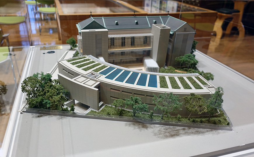 국제 어린이도서관 중정. 신관(아치 동)의 유리 벽면이 웅장한 곡선을 그리고 있습니다.
