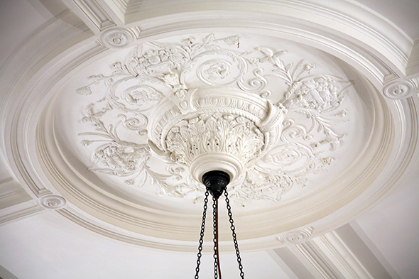 아동서 갤러리의 4개의 원기둥은 철골에 대나무를 엮은 ‘다케코마이’를 감아 회반죽으로 마감한 것입니다. 기둥의 장식은 석고 틀에 회반죽을 채우고 굳기 전에 틀에서 뺀 후 부착하는 공법이 사용되었습니다. 또한, 천장 장식은 미장 장인이 흙손으로 그린 릴리프로 만들어졌습니다. 복원할 때에는 당시와 같은 방식으로 이루어져 그 기술이 이어지고 있습니다.
