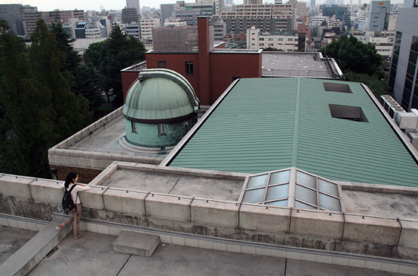 This is the roof of Japan Gallery. The building was originally located in Yushima, but completely destroyed during the Great Kanto Earthquake. Later, the building was reconstructed in the present location as part of the earthquake rehabilitation project. The construction was finished in 1930, and officially completed in 1931. Since the building was built through the project, its structure is very sturdy. The quake-resistant engineering at that time, which made use of many steel frames and thick pillars, was applied to the building. As viewed from above, the building looks like an airplane, which was a symbol of the state-of-the-art science and technology at that time. We are now just standing atop a place that corresponds to a cockpit of the airplane.(continued in the next page)