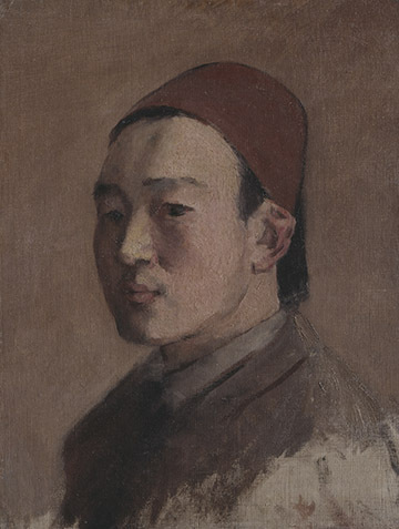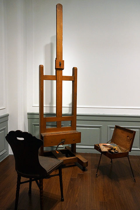 This easel was used by Kuroda. In a picture of his studio shot around 1907, Kuroda and this easel can be seen. Exhibits in the memorial room are periodically changed so that visitors can see his paintings and drawings chronologically. Now art works created when he stayed in France and after he returned home are exhibited. For example, this painting titled "A Nap" was created when he rediscovered Japanese customs after coming back to Japan. One of Kuroda's missions was to have Western art take root in Japan. He tried to achieve the goal by expressing Japanese customs with Western techniques. However, he was appointed to a variety of important posts since the end of the Meiji Period, so compared to other artists, he was not prolific, and most of the paintings he created in his later years are small. (continued in the lower column)