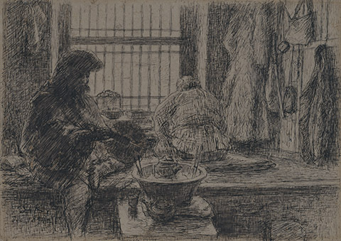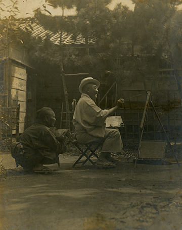 He served in the Sino-Japanese War, but stayed in the rear as a war correspondent and depicted soldiers' daily lives. According to his diary, in order to depict battles, he went to battlefields after battles were finished and interviewed soldiers. (continued in the lower column)