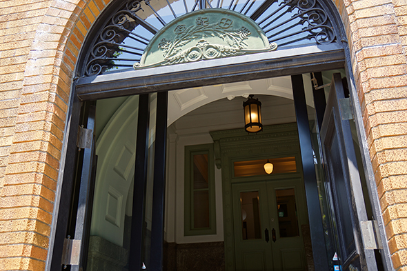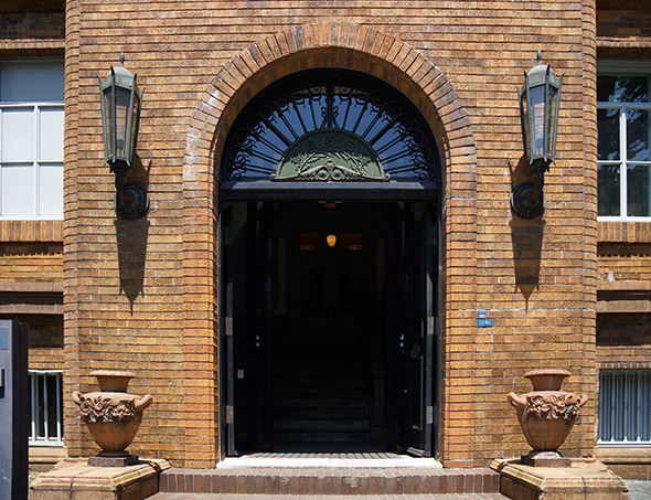 Kuroda Memorial Hall / Tokyo National Research Institute for Cultural Properties was founded as an art institute in 1930 after Kuroda's death in 1924 making use of his bequest. The hall was designed by Architect Shinichiro Okada (1883-1932), and built as an art library and institute following an architectural style at that time at the suggestion of Yukio Yashiro, an art researcher. Now it is run as a facility where Kuroda's achievements and paintings are stored and introduced to the public. Shinichiro Okada was an architect who had a profound knowledge of museum building. He also served as a professor at Tokyo Fine Arts School, and designed the former Tokyo Prefectural Museum and the former Kabukiza Theater. Architectural styles that were popular in 1920s and 1930s are noticeably reflected in the building of Kuroda Memorial Hall. Those styles can be seen in ornaments attached on the exterior and in exhibition rooms.