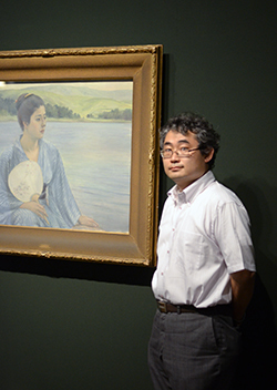 このイーゼルは清輝が使用していた物です。明治40年(1907)頃のアトリエの写真では、このイーゼルを前にした清輝が撮影されています。記念室の作品は常設展示ではなく随時替えていますが、清輝の作品を時代を追って概観できる展示を行っています。現在は、フランスに留学しておりました時期の作品から帰国した時期の作品を展示しています。例えば、こちらの「昼寝」と題された作品は、帰国後に日本の風俗を改めて見つめた作品とも言えます。清輝の使命のひとつとして、西洋美術をいかに日本に根付かせるかという事がありましたが、日本人にも馴染みやすい風俗をモチーフに、西洋の表現技術を用いる事で、その目的を達成しようと試みています。ただ清輝は明治末以降は様々な要職に就いたので、他の作家に比べると寡作で、特に晩年には小品が多いですね。(下段に続く)