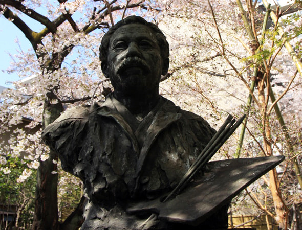 在書法博物館的庭園裏,不折的銅像被鮮花錦簇著。為了體現他曾經是一位西洋畫家,在他的手裏握著調色板和畫筆。