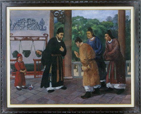 The painting was created under the theme of a historical event during the Spring and Autumn Period in China. In the painting, vessels (left), which overturn when they are filled up with water, are likened to the arrogance of human beings. A person in the middle of the painting is Confucius. Fusetsu Nakamura produced many historical paintings on Eastern themes, of which subject matters are historical events in China. Since many of those historical paintings are large works and reach a high degree of perfection, they are considered to be best works of Western-style painter Fusetsu Nakamura.