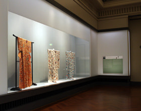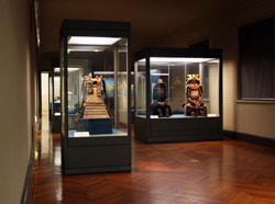 白絲威一的谷形盔(左面陳列的展品),德川家康將其傳給作為第一代水戶潘主的兒子賴房(注:德川賴房是德川家康的第11子,1603-1661)。(右面陳列的展品)黑韋素懸威的如意頭形盔,類似蝶形或葵葉形,也象佛教用具中如意的雲形。