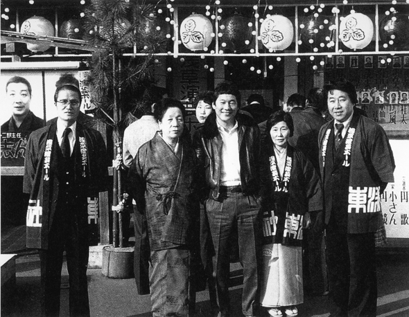北野武(中央)和現淺草演藝廳會長松倉(左)等工作人員在一起(東洋興業株式會社提供)