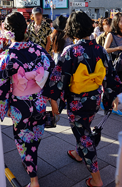 Girls wearing yukatas of various colors vie for fascination on the street.