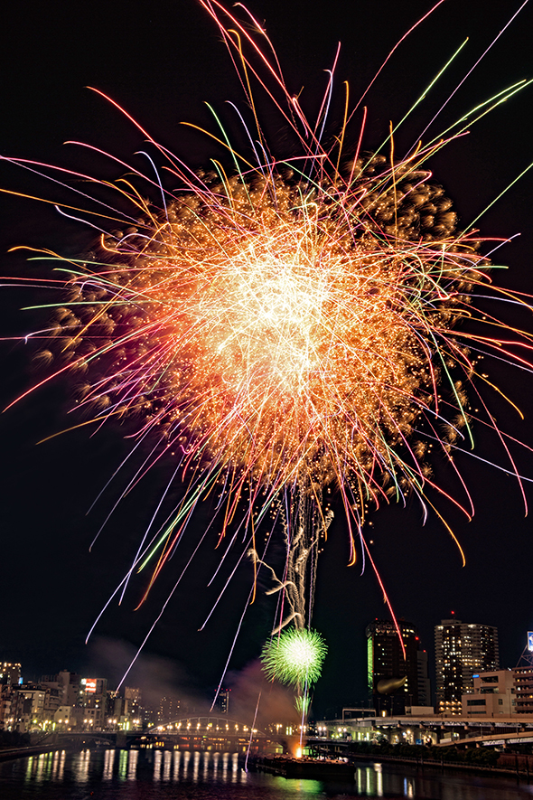 매년 7월에 개최되는 스미다가와 불꽃 대회는 도쿄의 불꽃놀이 중에서도 매회 100만 명에 가까운 인파가 몰리는 큰 행사로써, 방송으로 생중계도 이루어지고 있습니다. 스미다가와에 놓인 사쿠라바시부터 고토토이바시 사이에 설치된 제 1회장과 고마카타바시에서 우마야바시 사이에 마련된 제 2회장의 두 곳에서 경연이 이루어지는 불꽃 콩쿠르가 개최됩니다. 재개된 쇼와 53년(1978)부터 40회째를 맞이하면서 도쿄 여름의 풍물이 되었습니다.