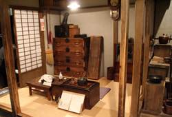 年老いた母と娘が営む駄菓子屋の居間の卓袱台(ちゃぶだい)、姫鏡台、針箱や絎台(くけだい)などから、つつましく簡素な生活が見えます。井戸や路地を共有したこのような長屋の暮らしから、下町独特の人情や気質が生まれました。