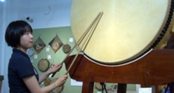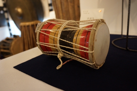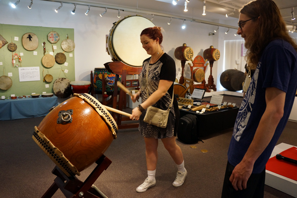 采訪之際,展示室裏展示著200到250件左右來自世界各地的太鼓。中央部分是日本的太鼓,進入入口後的右手邊是中南美的太鼓,左手邊是非洲的太鼓,正對面的裏面展示陳列著中東、歐洲、亞洲圈的擁有各種各樣表情的太鼓。展示品的解說上都貼著標記,紅色標記表示樂器不可以觸摸,貼有音符符號的標記是可以隨便觸摸和敲打演奏的。