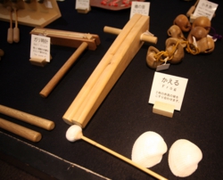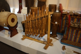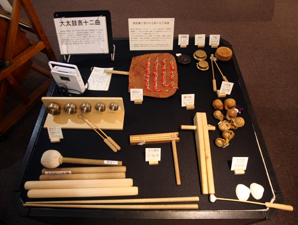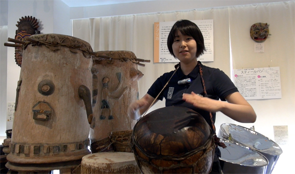 取材時には、展示室に200点から250点程の世界各地の太鼓が展示されていました。中央に日本の太鼓類、入り口より入って右手に中南米の太鼓、左手にアフリカの太鼓、正面奥に中東、ヨーロッパ、アジア圏の様々な表情を持った太鼓が展示されていました。展示品の解説にはシールが付されており、赤いシールの楽器には触れる事は出来ませんが、音譜マークが付されている楽器は実際に触れたり、叩いて演奏する事が出来ます。