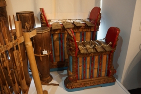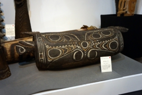 スリットドラムとも呼ばれていますが、木をくりぬいて作った割れ目を打って鳴らします。日本では、撥(ばち)を用いて叩く、いわゆる撥を振ると言いますが、ガラムートは突くようにして鳴らします。実際に使用する際は、下に板を置くため、もう少し響きがなめらかになります。装飾は、先祖の霊を模していると言われます。