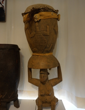 太鼓によっては、性別や用途によって、形が異なるものがあります。例えば、セヌフォ族の太鼓では男性、女性の成人の儀礼に用いられるものですが、こちらは河馬(かば)の姿を模した太鼓(上)で、強い男性を意味しています。女性の方(下)は、頭上に荷物を抱え働いている姿になっています。