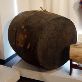 コートジボワールでは瓢箪を用いたり、カモシカの皮を張っています。演奏方法は、紐を首から前に下げて両手で打ちます。この太鼓も実際に叩く事が出来ます。
