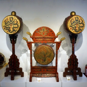 左右の一対を建鼓(けんこ)、中央のものを架鼓(かこ)と言います。建鼓の鼓面に描かれた龍は5本の爪を持っています。この模様は中国、清王朝の皇帝と皇后にしか許されなかった模様なので、これもそのような場で実際に用いられていたのだろうと思われます。アジア圏では、皮の留めに鋲が多用されます。日本も含めて東アジアに共通する特徴です。