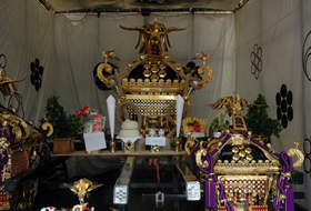 鸟越神社的大神兴“千贯神兴” 在组装现场的天棚上装饰着威武升天的龙。 街道会的神轿是由街道会的人们用亲手组装起来的。通过施展各不相同的精巧手工技艺,神轿在他们的手中变得造型各异,表现丰富,华丽细致。 在组装现场的天棚上装饰着威武升天的龙。