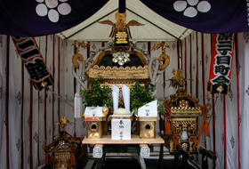 도리고에 신사의 큰 미코시 ‘센간 미코시’ 뼈대가 조립되는 곳의 천정에는 웅장하게 승천하는 용의 모습이 있었습니다. 쵸카이의 미코시는 쵸카이 사람들의 손으로 조립됩니다. 미코시는 점점 그 화려한 모습을 드러냅니다. 각각 화려한 세공이 가해져 다양한 표정을 보이기 시작합니다. 뼈대가 조립되는 곳의 천정에는 웅장하게 승천하는 용의 모습이 있었습니다.