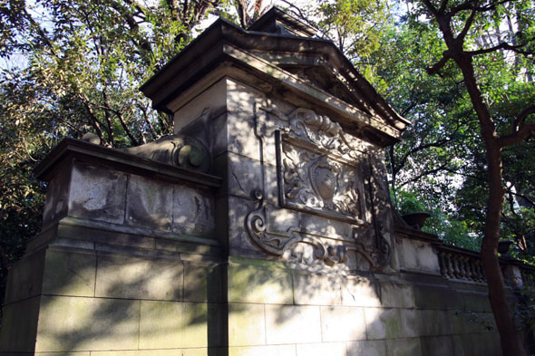 从旧岩崎府邸园林的正门,走上一个小斜坡,那里耸立着壮大的围墙。中央画着岩崎家族的家徽“三阶菱”。三阶菱就是后来三菱公司标示的雏形。