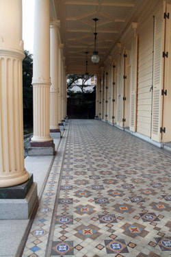 It turned out recently that this four-leaf pattern floor tiles are inlaid Victorian tiles, produced by Mintons Ltd and designed by Augustus Welby Northmore Pugin in around 1850. This company's pottery factory (Minton Hollins Factory) is still being used by The Royal Doulton Company.