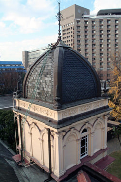それが分らないのです。三井クラブなどは接収から返還された際にはそのまま戻されたのですが、旧岩崎邸はある意味没収ですから、おそらく色々な家具や調度品は相当な物があったと思いますが、それらがほとんど無くなっています。現在、書斎にある書架は、熱海の別邸の倉庫に接収前に避難していたものですが、久彌氏は本が好きで大変な蔵書があったようですが、そういう物の多くは熱海の別邸の倉庫に接収前に避難されています。本庭園を開園した際も、家の中に調度品が無いのは家ではないと言う人もいましたが、まるっきり見当たりません。後になってから岩崎家四代目の寛弥氏が「良く管理されているが、寂しい」と言われて、そういえば熱海の別邸に書架があったから寄贈しようと尽力頂いて元の場所に戻ってきました。当時の食器類も一部接収前に持ち出した物が東京会館に保管されていて、その中からバカラの食器なども最近寄贈して頂きました。そのようにして調度品が徐々に増えていっているのですが、残念ながら寛弥氏が平成20年(2008)7月にお亡くなりになりました。私は平成13年(2001)の開園の際に赴任していましたが、寛弥さんのアドバイスが無ければ維持管理なども含めて出来なかったですね。その年は、そのような意味で大変辛い年でした。調度品類では、たとえば食器がバカラで、ではシャンデリアが何だったのか。それ相応の物があったのではないでしょうか。因みに迎賓館はバカラのシャンデリアですが、今となっては分らないですね。(次ページに続く)