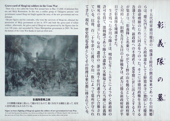 Clansmen and warriors, who gathered to ask for the commutation of the death sentence of Yoshinobu staying in the Kan-eiji Temple, called themselves the "Shogitai," placed their base in the Ueno area and fought against the government army. In this Battle of Ueno, the Shogitai was ruined. Then, there was the return of political power to the Emperor and the restoration of the imperial rule. The 700-year history of the shogunate since the Kamakura Shogunate came to the end.