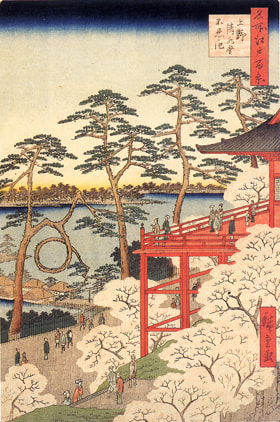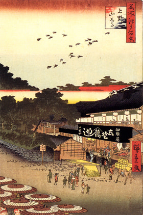 우에노의 숲만큼 에도에서 메이지로의 변혁기, 그리고 타이쇼와 쇼와의 역사를 간직한 곳도 없을 것입니다. 그리고 우에노 간에이지는 그 중심이라고 할 수 있습니다. 에도시대에는 도쿠가와 장군가의 보리사로서, 우에노 야마시타 또한 절을 중심으로 한 마을로서 번창했습니다. 우타가와 히로시게(안도 히로시게)가 그린 「에도 백경」에도 그 번창했던 모습이 남아 있습니다.