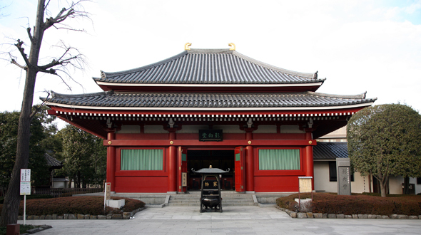 鐮倉時代編輯的《吾妻鏡》中有記載說,當時有很多僧侶在淺草寺裏工作。另外還曾經在寺院內挖掘出很多中世紀的瓦,所以可推斷這裏曾經是個瓦屋頂的寺院。那時候的瓦比現在的重,爲了支撐屋頂的重瓦,必須用榧木的木板等堅固的木頭建造屋頂才行。因此淺草寺從古代開始就是座氣勢雄偉的寺院。可是至今爲止由于戰火和災害淺草寺曾經數度被燒毀。發生在1772年(安永元年)的江戶大火燒毀了境內的傳法院,導致貴重古文書丟失;發生在1865年(慶應元年)的淺草火災燒毀了雷門和山內的14個附屬寺院;在1945年(昭和20)的戰災中,德川第三代將軍家光修建的被定爲國寶的舊本堂、仁王門、五重塔和輪藏等又被燒毀。現在的本堂是在1958年(昭和33)由負責過飛鳥•奈良時代的多數文物建築的修理保存工程的建築家大岡實(1900-87)設計的。建築采用耐火性強的鋼筋混凝土結構,屋頂采用了飛鳥形式(用平瓦和圓瓦交互組合排列方式修建的屋頂)等,如期改建成爲目前這座壯觀的建築。在平成(1989年至今)本堂大修繕活動中,從2009年(平成21)2月開始用了約2年多的時間,對外牆和屋頂瓦進行了整修和更換。在2010年(平成22)11月修繕工作完成的時候,由于改用了既輕又抗震的钛制金屬屋面瓦等措施,建築景觀倍加煥發光彩。