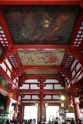 浅草寺本堂外面参拜殿的藻井中央是川端龙子画的《龙之图》(1956),左右是堂本印象(日本画家)画的《天人之图》(1957)。