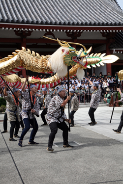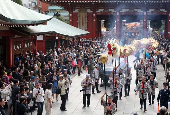 金龙舞是因为浅草寺的山号叫“金龙山”而得名的舞,1958年(昭和33)为纪念正殿的重建而创始敬奉的。《浅草寺缘起》上说,观音示现世时“寺边的天空中有金龙从天而降,一夜之间化做千棵的松林(是现世五谷丰登的象征)”。扮作松林的是来自浅草寺幼稚园的小朋友们组成的松慈童,和一名象征观音菩萨的“莲华珠”,再由8个人操纵着金龙(长18米,重约88公斤)做守护。在浅草工会花组的伴奏声中,跳着雄壮华丽的金龙舞。