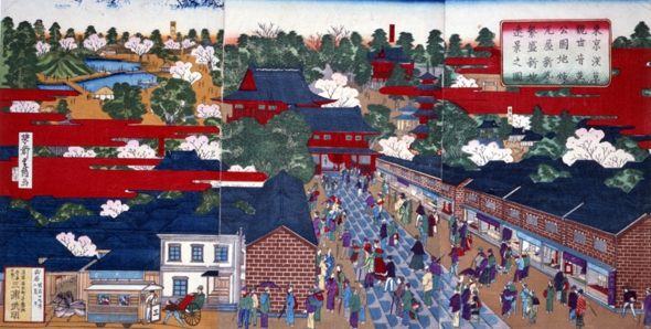 Overall View of Senso-ji Temple around 1886. Brick-built stores and people dressed in European style are depicted.