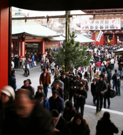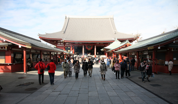 In 645, Shokai-shonin received a divine message in his dream that the principal image in Kinryusan Senso-ji Temple should be kept secret, so the image has never been open to the public up to the present. Asakusa facing Tokyo Bay was developed as the number of believers who visited Senso-ji Temple grew. In the early Heian Period, Jikaku-daishi Ennin (794-864), a restorer of Senso-ji Temple and the third chief abbot of Enryaku-ji Temple, visited Senso-ji Temple, and carved a replica of the principal image. In the Kamakura Period, the Shogunate became believers of Senso-ji Temple, and famous warlords also came to believe in and protect the temple. As a result, its scale was further expanded. In the early Edo Period, Shogun Ieyasu Tokugawa (1543-1616) designated the temple as the Shogunate's prayer temple, and its dignity was further enhanced. Senso-ji Temple and the Asakusa area continued to thrive as a center of the Edo culture. Senso-ji Temple, the oldest temple in Tokyo, which is also called "Asakusa Kannon," has attracted widespread popularity. It has become the center of the folk belief, to which a total of more than 30 million worshippers visit in a year. (continued in the lower column)