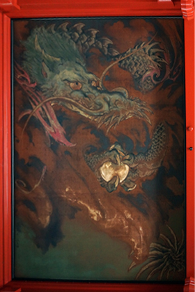 "Ryu-no Zu," (1956) or image of a dragon, by Ryusi Kawabata is depicted on the center of the outer chamber's ceiling of the inner temple, and "Tennin-no Zu," (1957) or image of a heavenly being, by Insho Domoto on both sides of it.