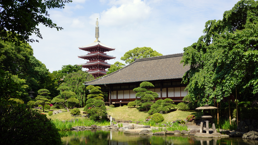 Denpo-in is the chief priest's living quarters, located in Senso-ji Temple precincts, and consists of several buildings, including a guest hall and a main entrance, which were built in 1777, a main drawing room, which was built in 1902, and a living room for the head priest, which was rebuilt in the Taisho Period. Although Denpo-in was called "Kannon-in" or "Chiraku-in" when it was built, the name was changed to Denpo-in during the Genroku Period (1688-1704). The Amitabha and two bodhisattvas are enshrined in the guest hall, and memorial tablets of successive shoguns of the Tokugawa shogunate, and memorial tablets of successive head priests of Senso-ji Temple are also enshrined on both sides of the Buddhist images. Buddhist services, including "Sange-e," an anniversary of Dengyo-daishi's death and "Tendai-e," an anniversary of Tendai-daishi's death, are held in the hall. The approximately 12,230 square meters garden with lush green is a landscape garden in a circular style, which is said to have been designed by Enshu Kobori in the Kanei Period (1624-42). Denpo-in's garden had been a garden for imperial prince abbots and kept secret from the public for a long time. Although the garden is still not open to the public, some special events, including a garden tour and a tea ceremony, are sometimes held in the garden.