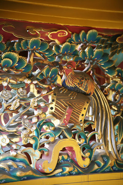 정식 명칭은 '가라하후즈쿠리요츠아시몬’이라 하며, 국가지정 중요문화재로 지정되어 있습니다. 양쪽에는 에도시대 초기의 조각가인 히다리 진고로 작품인 승천하는 용이 자리 잡고 있습니다. 상단에는 금계조, 은계조의 투조가 있으며, 문 안쪽에는 중국의 고사에서 유래한 간고조에 대한 조각이 있습니다.