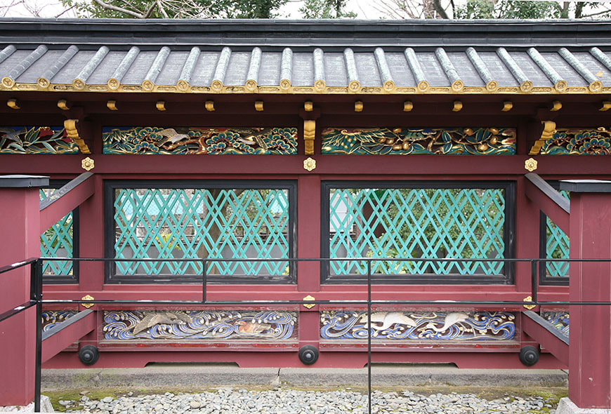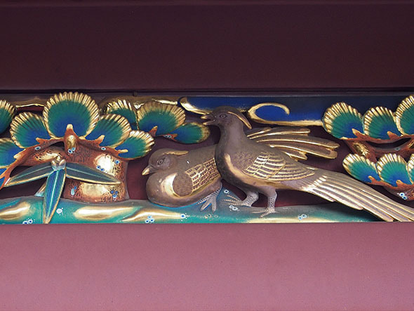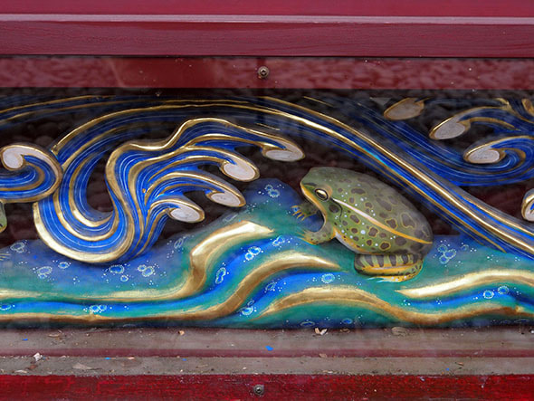 건너편이 비쳐 보이는 스키베이(투병)의 상부에는 야산의 짐승과 식물, 하단에는 바다 강의 생물 이백여 개가 조각되어 있습니다. 제작 당시에는 극채색이었다고 여겨지지만, 이후 보수 때 모두 옻으로 덧칠해졌습니다. 헤세이 21년(2009)부터 25년(2013)의 보존 수리 공사에서는 제작 당시의 조각이나 그림을 참고로 처음과 같이 석채로 이케사이시키(생채색)가 이루어졌습니다. 이케사이시키는 금박으로 덮은 후에 물감으로 채색을 하는 호화로운 채색 방법입니다.