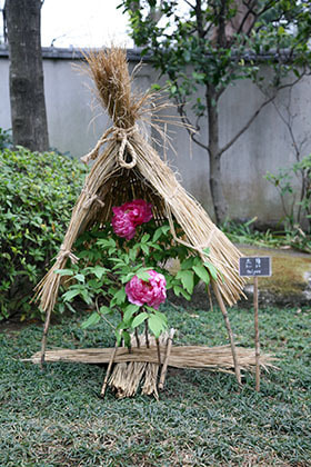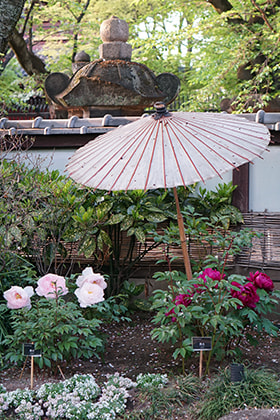회유식(일본 정원 양식의 하나)으로 정비된 정원에 심어진 모란은 개원 초기에는 70종 정도였지만, 현재는 봄에는 110품종 600그루, 겨울에는 40품종 200그루로 늘었었습니다. 특히, 초록 계통의 '마리모', 두 가지 색으로 이루어진 ‘니쿄’, 겨울 모란인 ‘도가와칸’은 특히 희소성이 높은 품종입니다. 지금은 중국 품종과 일본 품종에 더해 미국과 유럽의 품종도 추가되었습니다.