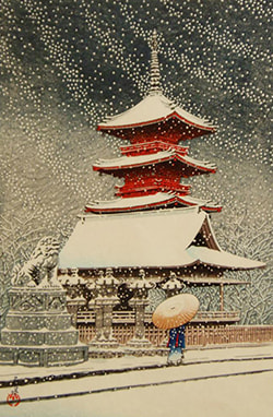 다이쇼, 쇼와 시대에 쇠퇴한 우키요에 판화의 부흥을 목표로, 새로운 판화 운동을 일으킨 ‘쇼와의 히로시게’라 불린 가와세 하스이는 우에노 도쇼구의 설경을 묘사했습니다. (우에노 도쇼구 소장)