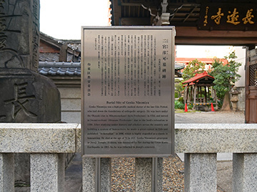 Genka Ninomiya was a high-profile medical doctor of the late Edo Period, who laid down the foundations of orthopedic surgery. He was born under the Okazaki Clan in Mikawa-no-kuni (Aichi Prefecture) in 1754 and moved to Iwami-no-kuni (Shimane Prefecture) due to the lord's relocation in 1769. After studying under doctors and scholars across the country and building a system of bonesetters, he made a great career in Edo and published "Seikotsuhan" in 1808, which is highly regarded as a classic in bonesetting. He died at the age of 74 in 1827. Genka Ninomiya's gravepost in Choen-ji Temple, Asakusa, was destroyed by fire during the Great Kanto Earthquake in 1923. So, he was reburied in Choen-ji's cemetery.