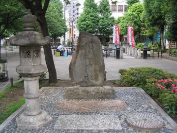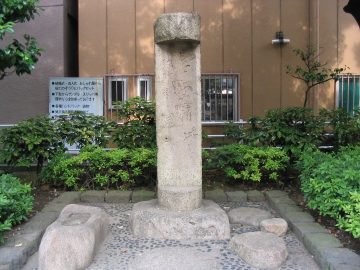 歌碑は、明治12年(1879)九世団十郎が中心となり、日頃世話になっている日本橋の須永彦兵衛(通称棒彦)という人を顕彰して、彦兵衛の菩提寺仰願寺(現清川1丁目4番6号)に建立した。大正12年(1923)関東大震災で崩壊し、しばらくは土中に埋没していたが、後に発見、碑創建の際に世話役を務めた人物の子息により、この地に再造立された。台石に「花川戸鳶平治郎」、碑裏に「昭和三十三年秋再建 鳶花川戸桶田」と刻む。