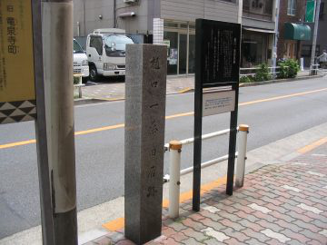 樋口一葉は明治26年(1893)7月20日、本郷菊坂町より下谷竜泉寺368番地に移り住み、この界隈を背景にして不朽の名作「たけくらべ」や「わかれ道」の題材を得た。この碑の位置は、一葉宅の左隣り酒屋の跡にて、一葉と同番地の西端に近く碑より東方6メートルが旧居に当る。