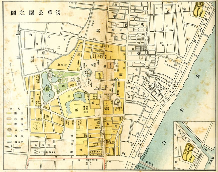 《Vita Sexualis》中的描寫,從吾妻橋出發、經過並木、去往仲見世,一路信步暢行的樣子。(舊町名)