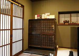 玄関にあります下駄箱は森鴎外が使用していた下駄箱です。とても古いもので、明治19年(1886)頃のものだと言われています。釘が一本も使用されていない下駄箱です。