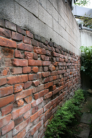 赤松家の敷地を示す赤レンガの一部が今も外壁に残されています。