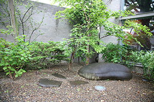 鴎外が腰掛け、露伴、緑雨と共に写真撮影をした庭石「三人冗語の石」は、現在も記念館の庭園に残されています。