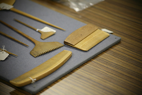 解かし櫛(とかしくし)や結櫛(ゆいくし、髷(まげ)を結うために用いた櫛)等が、日本髪に用いられました。(台東区立下町風俗資料館蔵)
