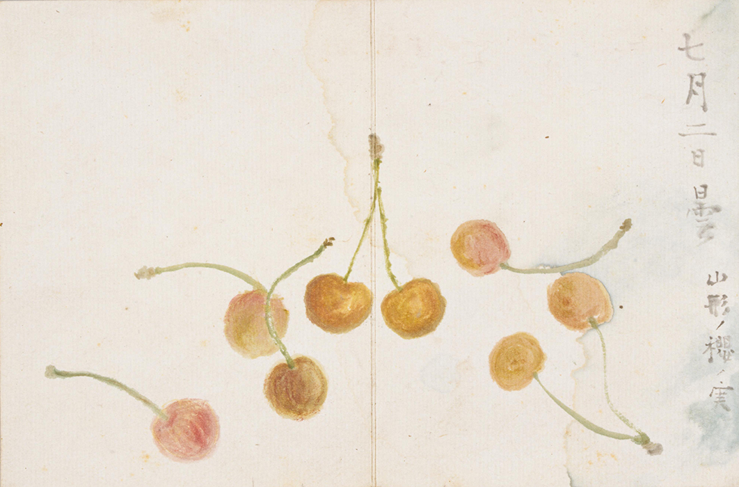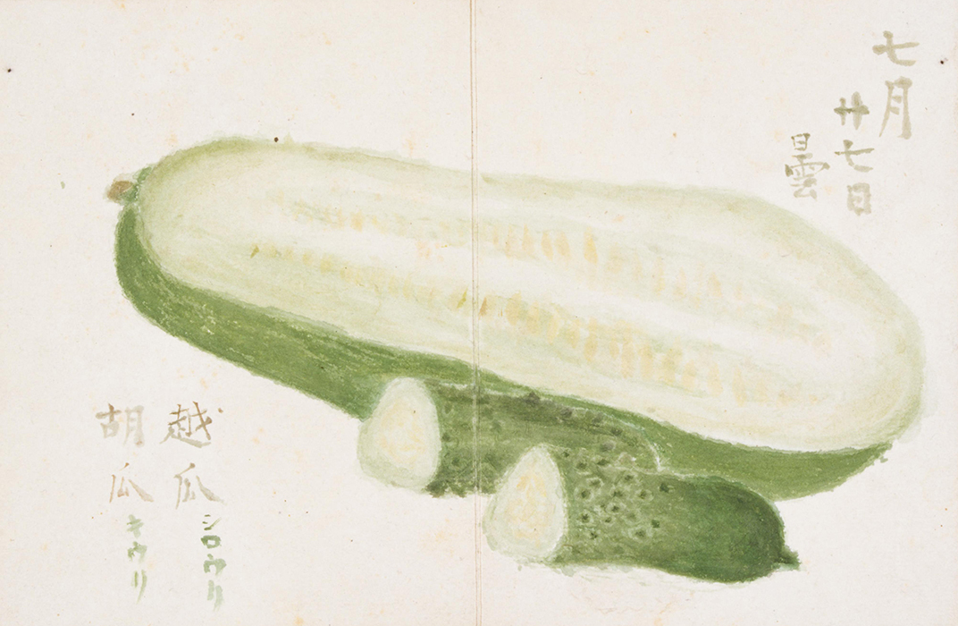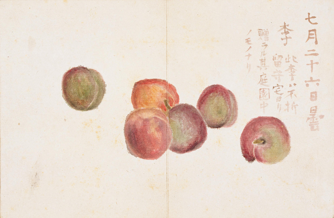 子規在他去世那年明治35年(1902)的6月27日至8月6日之間,畫了18張蔬菜和水果的水彩畫,題名爲《果物帖》。委托子規揮毫作畫(長12cm、橫9cm,盒裝)的是子規的俳句弟子蘇山人,由于蘇山人在清國去世,子規就將這些水彩畫留爲了己用,其中還包括畫家朋友下村爲山的兩幅俳畫。這個時期,子規的骨瘍病情加重,每天都要服用嗎啡止疼,在妹妹的護理下,子規仰躺著在藥力上來不疼的時候畫的這些畫,姿勢很不方便。