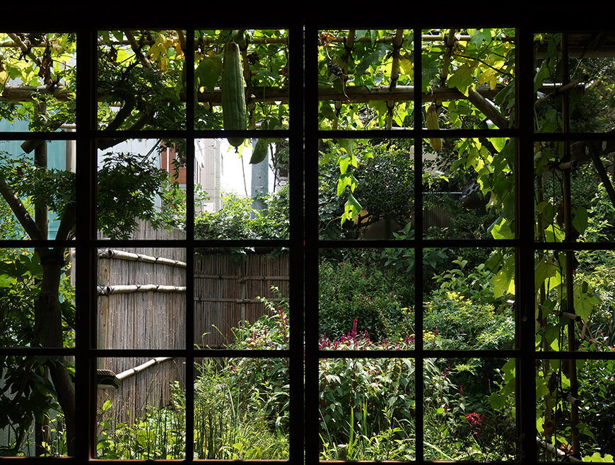 左手边的棚子,是1901年6月找花匠来搭建的丝瓜棚,大小有现在丝瓜棚的2倍大。正面南侧的篱笆墙上装有木门,从左手的远处能望见上野之山。