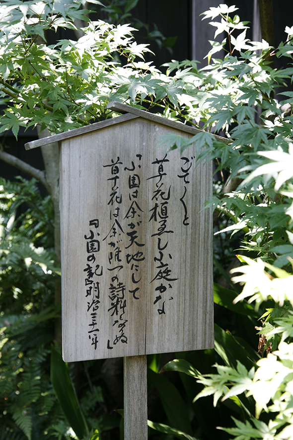 明治31年(1898),子规在俳句杂志《杜鹃》上刊登了一篇题目为《小园之记》的散文,文章描写了子规庵的庭园。文章的开头第一句写着“我家有个二十坪(约67平方米)的小园子。”,接着写道,他刚搬来的时候,砍掉园子里竹丛,也没有什么草木还是光秃秃的,后来房东给种了三棵小松树,邻居老妇人给了玫瑰苗。他还写道,当玫瑰开出四、五朵花的时候,作俳句作和歌的精神就会徒然振奋起来。牵牛花开完以后到了八月末,等呀盼呀的胡枝子花终于开出了一支两支,他形容自己那时候的心情是“高兴得要跳起来了”。到了秋天又开始担心花草被风吹怀了。文章描写生动,好像园子就在读者的眼前一样活灵活现,小小庭园里的草木生长,给生病中的子规和他的文学创作带来了多么大的安慰与动力,从他写的这句“小园给了我一片天地,花草是我唯一的诗料”中可见一斑。这篇散文的结尾有俳句,和现在子规庵的庭园一样。